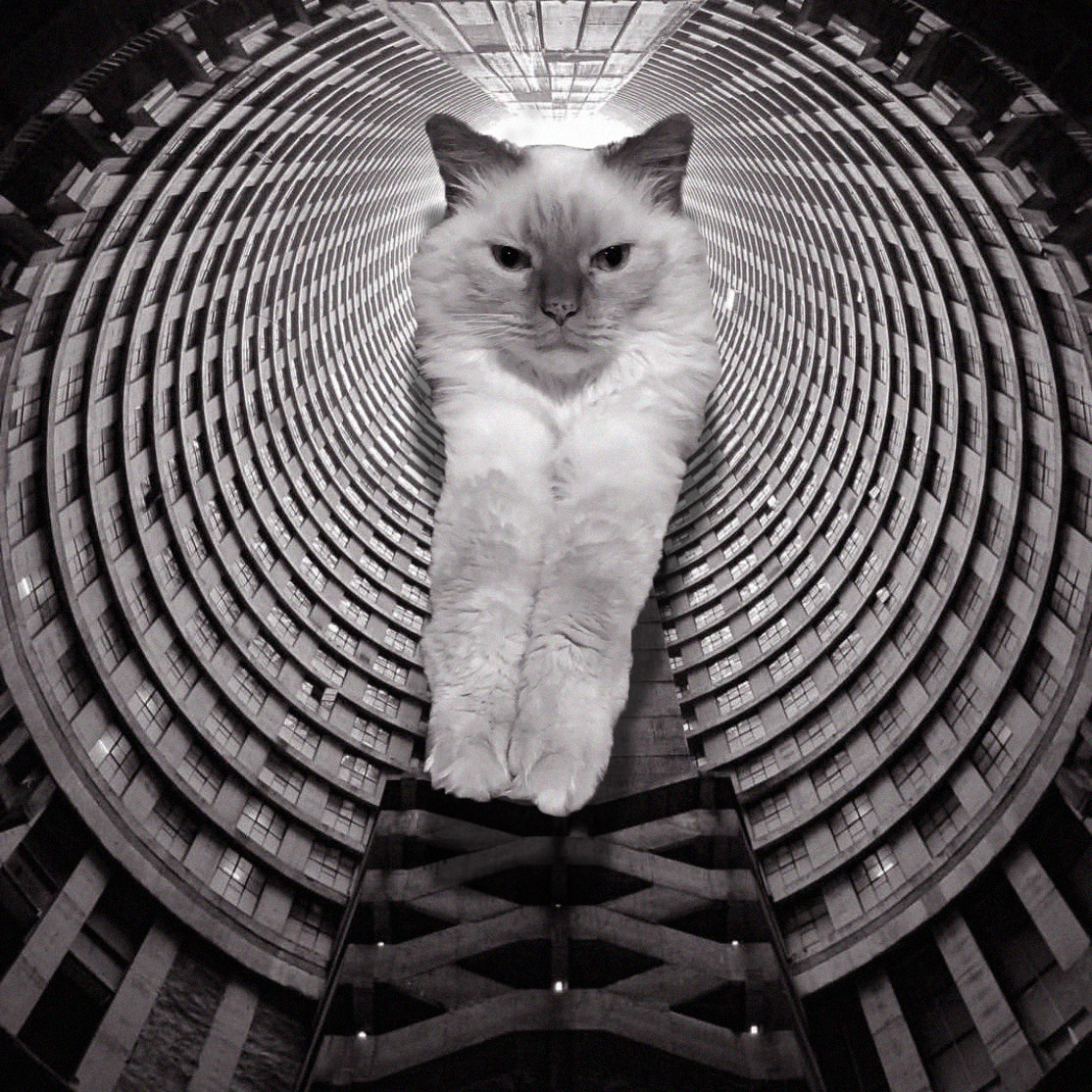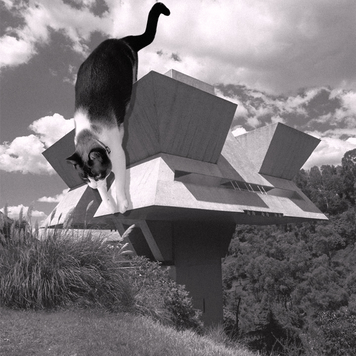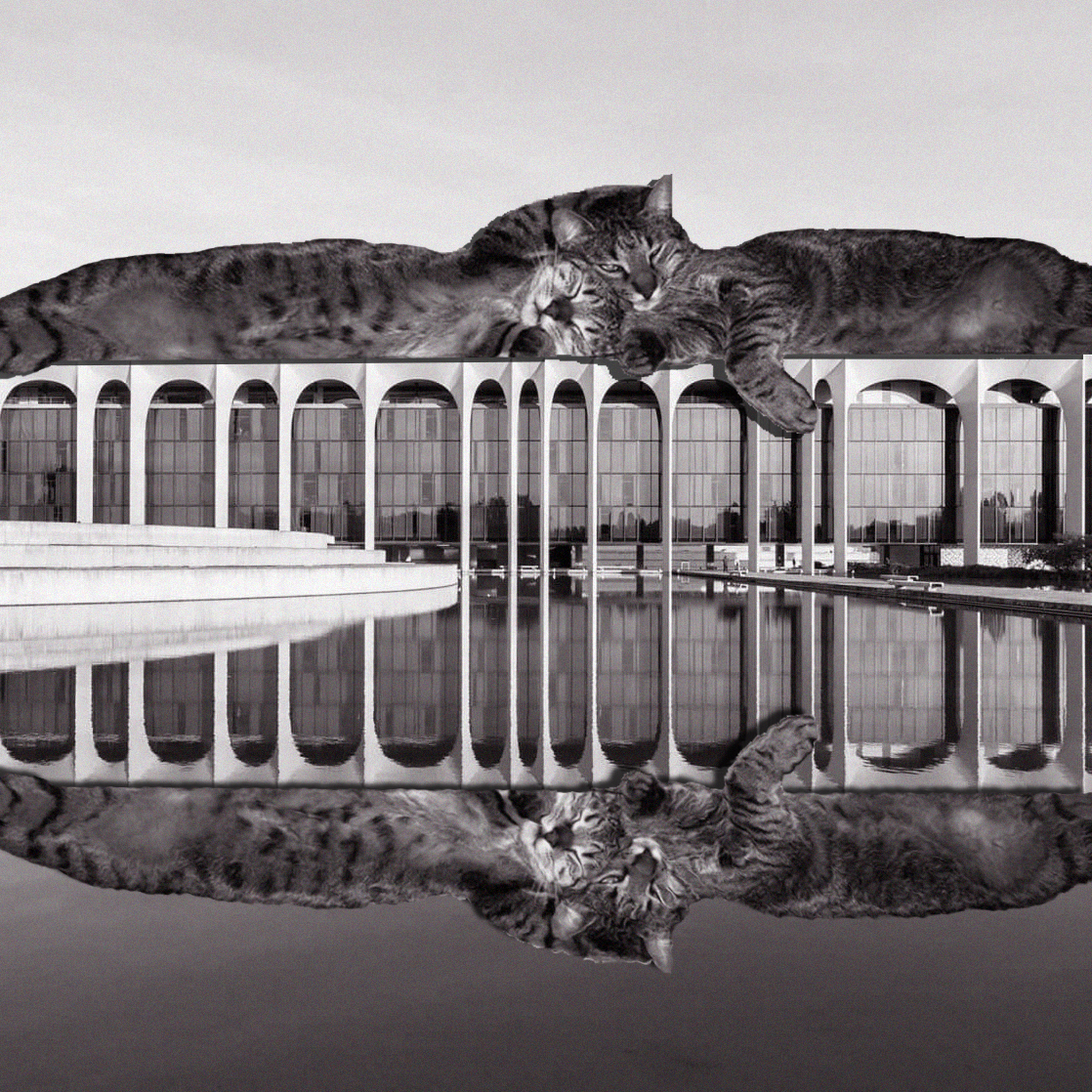 The synthesis of soft feline lines with stark corners and huge footprints caught fire in the crosswinds of cats and Internet, and in December, The New York Times named Cats of Brutalismopens in new tab one of “5 Art Accounts to Follow on Instagram Now.” Zooming in from Buffalo, Battaglia, Ong, and Senay share their experience curating an exceptionally elegant meme — Senay against a dark background from which a black, green-eyed cat seems to appear and vanish, Cheshire-like, on her lap.