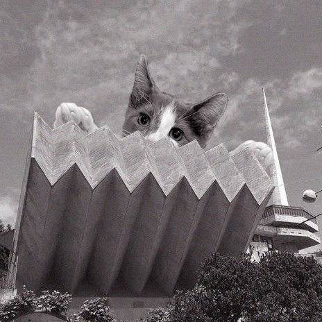 The two elements were hiding in plain sight, waiting for some visionary to sense their potential harmony as a union. Cats and Brutalist architecture — mmm-wah! Emily Battaglia, Madelaine Ong, and Michaela Senay, architecture grad students at the University of Buffalo, found this magic combination as they sought to raise awareness of certain imperiled post-war structures. On a lark, they posted a photo of Senay’s Tabby, who she’d enlarged and set on the roof of Paul Rudolph’s dramatic 1969 Earl W. Brydges Library.