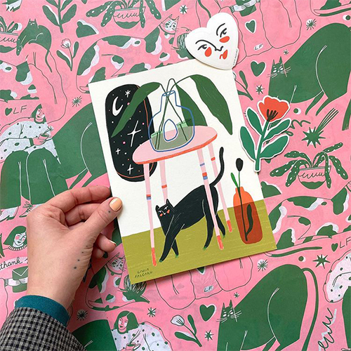 “I usually draw things from my daily life and they’re constantly a part of it,” the Bucharest-based artist says of her kitties Lily and Ida. “I just simply like the idea of cats and their specific things.” The duo consistently pops up in her work, often decked out with Fălcaru’s signature exaggerated whiskers and round bodies. “Throwing in a cat is something that comes naturally now when I make an illustration,” and they’ve popped up everywhere from her custom wrapping paperopens in new tab to surprise cameos in jigsaw puzzles. opens in new tab We caught up with Fălcaru to talk about her artistic process, being vulnerable online, and why cats make the best muses.