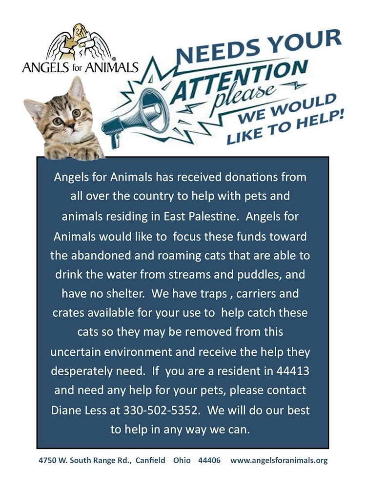 “This will get the ball rolling. We will need boots on the ground to pull this off,” she said, adding that Angels is fundraising for their BOGO spay/neuter event, mentioned at the bottom of this page hereopens in new tab. With this special, someone can bring in two cats and receive one spay or neuter for free. Less said that donors can specify that they’d like their BOGO funds to go toward East Palestine rescues, as Angels aims to continue to help strays in the area.