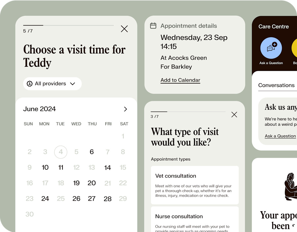 Book your vet visit in a few taps. You can select your time, location and visit type – and add info for your vet to review.
